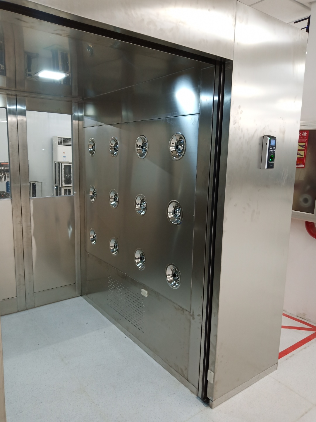 3.5按語音提示經(jīng)過風淋室紅外感應區(qū)。此時風淋室雙門自動上鎖,同時風淋室風機啟動開始吹淋?! ?br />