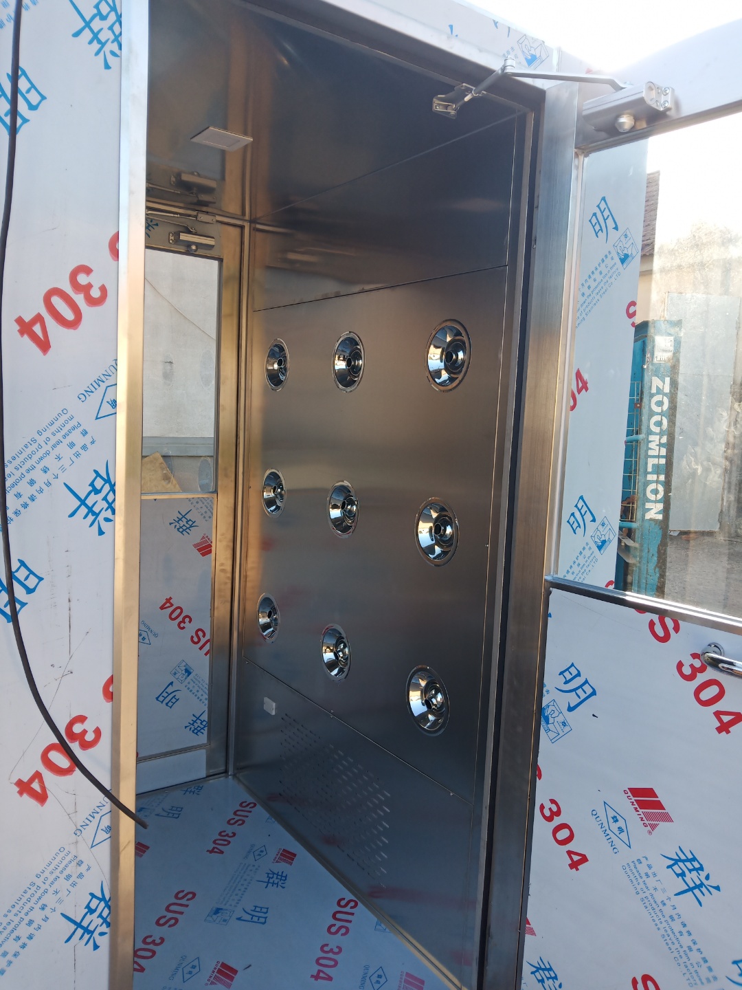 李經(jīng)理說,雖然目前生產(chǎn)車間并不是很大,工人也都屬于放假期間,但只要進(jìn)入車間,就必須要先經(jīng)過這個(gè)名為風(fēng)淋室的設(shè)備,風(fēng)淋室是凈化設(shè)備生產(chǎn)廠家生產(chǎn)的,目的就是為了進(jìn)入車間前去處身上的灰塵,保證產(chǎn)品的質(zhì)量。