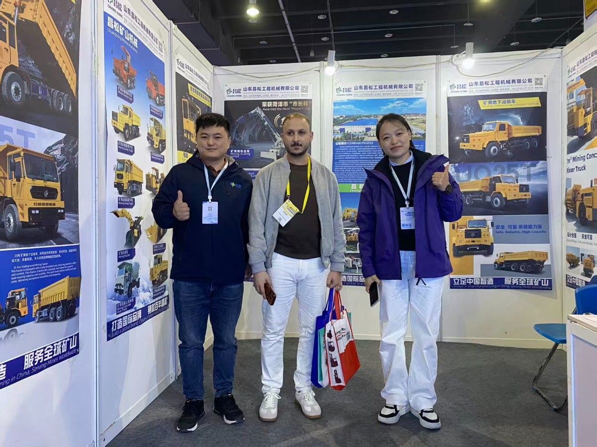 展會(huì)現(xiàn)場(chǎng)超熱鬧,山東昌松工程機(jī)械的展位前,中外客戶都來點(diǎn)贊。背景里的產(chǎn)品海報(bào)特吸睛,展示的工程機(jī)械性能強(qiáng)、技術(shù)新。